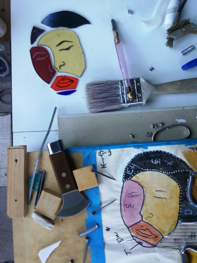 choosing the coloured glass with many textures is a delight. I learnt how to paint on the glass to include further detail.