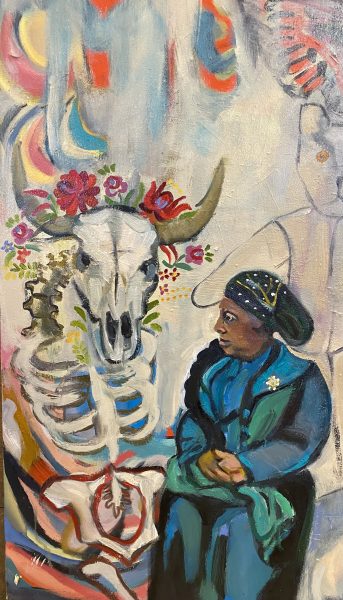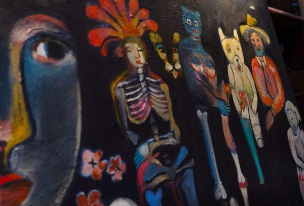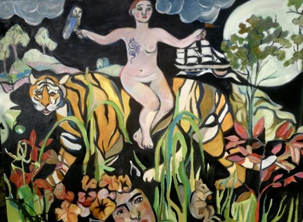 I particularly wanted to re work paintings that no longer inspire me. I used a stream of consciousness way of working and let the paintings suggest content. Complex narratives emerged and a sense of giving permission for characters in my psyche to come forward. Added to my interest in Folk Art and Outsider Art I let myself be playful. The door was open to the public and fruitful conversations were had.
